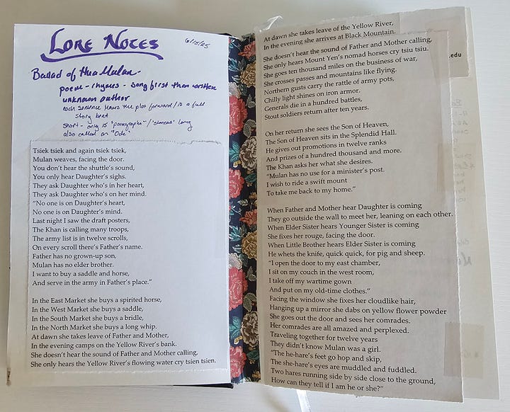 I chose to examine the Ballad of Hua Mulan first because itās a story Iām familiar with and would provide me with a quick study of the compositional difference between a ballad and an epic. Iāve also always wanted a copy of the translated text so, you know, win win. After reading the story and understanding the format, I decided a ballad is not the direction Iām wanting to go - at least not for the primary stories I have in mind, and further study of the other styles solidified for me that what I am striving for is a kind of epic, though less poetic, and without any rhyming.