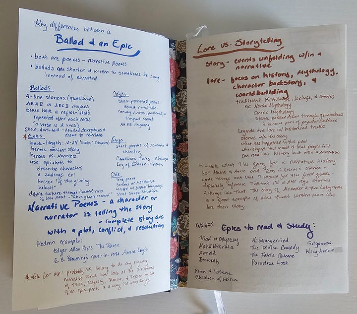 I started by looking up terms Iām familiar with but wanted to get a much deeper understanding of what they look like compositionally. I first needed to know the difference between ballads & epics because Iāve heard these terms sometimes used interchangeably, and that search led me to other styles such as lays, odes, and idylls. I took notes on all of these to not only compare and contrast but to have a quick cheat sheet to look back on should I ever decide to try out a different style.